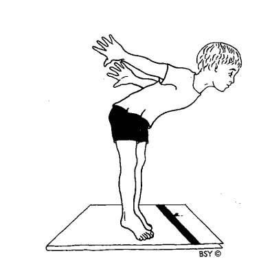 Расслабьтесь. Медленно наклонитесь вперед, туловище и голова находятся на одной линии. Одновременно поднимите назад правую ногу, держите ее прямой, на одной линии с туловищем и головой. Тело должно балансировать на левом бедренном суставе. Поднимите руки назад расправьте пальцы. Оставайтесь в такой позиции насколько это возможно, затем расслабьтесь и повторите с другой ногой. Дети могут издавать звук шмеля на выдохе.