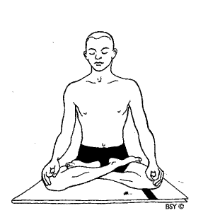 Падмасана (поза лотоса) Сядьте, ноги вытянуты вперед. Медленно и осторожно согните одну ногу, кладя стопу на внешнюю сторону бедра противоположной ноги. Стопа должна быть направлена вверх, пятка упираться в лобковую кость. Если все в порядке, согните вторую ногу, кладя стопу на внешнюю сторону противоположного бедра. В идеальной падмасане, колени должны касаться пола. Голова и спина выпрямлены, плечи расслаблены. Положите руки на колени Закройте глаза и попробуйте посидеть, не двигаясь и медленно дыша на протяжении одной – двух минут.