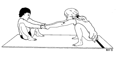 Катание на качелях Вначале, дети становятся напротив друг друга, взявшись за руки. Ноги на ширине плеч. Затем они одновременно садятся на корточки, убедившись, что подошвы ног полностью в контакте с полом. Продолжаясь держаться за руки, один ребенок садится на ягодицы. Затем, второй участник садится на пол и автоматически тянет первого на корточки. И вновь, первый участник садится обратно на пол, потянув своего партнера на корточки. Пусть они продолжают качаться на качелях подобным образом некоторое время.