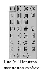 Чтобы приступить к построению формулы, показанной на рис. 56, делайте следующее: 1. Введите с клавиатуры букву d. Equation Editor автоматически вставляет введенную букву в поле. Сама буква набирается курсивом, так как обозначения переменных в математических формулах всегда имеют курсивное начертание. 2. Щелкните по третьей кнопке во втором ряду панели инструментов Формула, чтобы вывести на экран окно с доступными шаблонами степеней. Так как нам требуется возвести d в третью степень, выберите шаблон верхнего индекса (первый шаблон в первом ряду), как показано на рисунке 57. Equation Editor разместит рядом с буквой d поле для показателя степени (он меньше по размерам, чем поле для обычной буквы, и поднят относительно нее). 3. Введите цифру 3 и нажмите клавишу [Таb], чтобы выйти из поля верхнего индекса и вернуться в главное формульное поле. С помощью клавиши [Tab] осуществляется перемещение курсора вставки из одной части формулы в другую (например, из поля основания степени в поле показателя степени). 4. Теперь введите знак равенства. Таким образом, мы закончили первую часть уравнения, показанного на рис. 56. Размер любого элемента формулы можно менять с помощью команды Размер Þ Определить. В диалоговом окне «Размеры» вы можете указать новое значение размера для обычных символов, верхних и нижних индексов, специальных символов и любых определенных вами элементов. Следующая часть работы – построение кубического корня. Для этого сделайте следующее: 1. Щелкните по второй кнопке второго ряда панели инструментов Формула, чтобы вывести на экран список возможных конструкций с дробями и знаками корня. Нам из этого списка потребуется знак корня с указанием степени корня, который располагается во втором столбце четвертой строки, как показано на рис. 58. После вставки знака корня Equation Editor поместит курсор вставки в подкоренное выражение. 2. Нажмите клавишу [Tab], чтобы переместиться в поле показателя степени корня, и введите цифру 3. Если требуется ввести формулу под знак корня, используйте клавишу [Tab], чтобы переместиться в нужное место уравнения. Для этого сделайте следующее: 1. Нажмите [Shift], чтобы вернуться обратно в поле подкоренного выражения. Нажатие двух клавиш [Shift]+[Tab] перемещает курсор вставки по полям формулы в обратном порядке. 2. Находясь в поле под знаком корня, вставьте круглые скобки, выбрав первый шаблон из палитры скобок, показанной на рис. 59. 3. В поле, окруженное скобками, вставьте шаблон дроби. Для этого, поместив курсор вставки в поле, выберите шаблон дроби из той же палитры, как показано на рисунке справа. 4. В поле для числителя введите число 12. Вместо вставки скобок в формулу с помощью шаблона скобок, вы можете просто ввести скобки с клавиатуры. Этот способ ничем не хуже вставки шаблона, – но только до тех пор, пока внутри скобок не располагается лишь один обычный символ, например (х). Если же элемент, окруженный скобками, превышает по высоте строчную букву, то вам придется прибегнуть к шаблону, поскольку вставленные с его помощью скобки будут автоматически увеличиваться по высоте в соответствии с высотой выражения, заключенного в них. Последний шаг в создании нашей формулы – создание знаменателя дроби. Как и раньше, используйте клавишу [Tab] для перемещения из числителя в знаменатель. Сделайте следующее: 1. Нажмите клавишу [Tab], чтобы перейти в поле знаменател