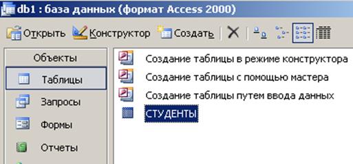 ТЕХНОЛОГИЯ РАБОТЫ 1. 1.1. выполните команду файл, открыть; 1.2. в диалоговом окне «открытие файла базы данных» найти нужный файл и щелкнуть кнопку «открыть». 2. Откройте таблицу СТУДЕНТ базы данных SESS. Для этого в окне «База данных. SESS» щелкните вкладку «Таблицы». В списке таблиц БД должна присутствовать и быть выделена только одна таблица СТУДЕНТЫ, в этом же окне щелкните кнопку «Открыть» 3. ACCESS переходит в табличный режим и открывает окно «СТУДЕНТ Таблица» 4. Введите данные в таблицу, как показано на рисунке. При вводе данных воспользуйтесь информацией, приведенной в краткой справке. 5. Познакомьтесь с возможностями быстрого перемещения в таблице, используя краткую справку 6. Отредактируйте введенные в таблицу данные, используя краткую справку: 6.1. в поле «Фамилия» второй записи таблицы полностью замените «Кравцов» на «Петров»; 6.2. в поле «Дата рождения» первой записи таблицы замените цифры года «76» на «75»; 6.3. удалите последнюю запись таблицы 7. Закройте таблицу, вводя дважды команду ФАЙЛ→Закрыть. Date: 2015-08-15; view: 518; Нарушение авторских прав |