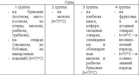 Супы Супы принято называть первыми блюдами, подают их за обедом после закусок и холодных блюд. Значительную часть супов готовят на бульонах, содержащих экстрактивные вещества, поэтому они способствуют возбуждению аппетита и усилению деятельности пищеварительных желез. Разнообразные добавляемые в супы овощи обогащают их витаминами, минеральными солями и органическими кислотами. Кроме того, в плотной части супов содержатся балластные углеводы (целлюлоза, гемицеллю-лозы, пектиновые вещества). Все супы делят на горячие и холодные. К горячим относят супы, приготовленные на бульонах (костном, мясокостном, из сельскохозяйственной птицы, рыбном) и отварах (грибном, овощном, из бобовых и макаронных изделий). Группу супов (на бульонах и отварах) по способу приготовления делят на три подгруппы - заправочные, пюреобразные и прозрачные. Схемы приготовления супов, относящихся к другим группам, в меньшей степени отличаются одна от другой поэтому такие супы внутри групп не подразделяют. Горячими отпускают также супы на молоке. Температура супов при отпуске должна быть 75—80°С. Холодные супы делают на хлебком квасе, охлажденном овощном отваре, охлажденных и обезжиренных бульонах (мясном, рыбном), пиве, кисло-молочных продуктах (кефире, простокваше). Температура холодных супов при отпуске не должна превышать 14°С. Сладкие супы на фруктовых и ягодных отварах выделяют в особую группу: в весенне-летний период их отпускают холодными, а в осенне-зимний — холодными и горячими.