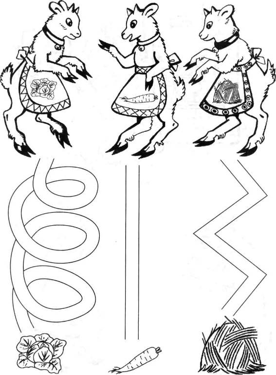 Положите перед каждым ребенком сюжетную картинку «Попробуй, найди» (см. рис. 7). Предложите детям внимательно ее рассмотреть. Попросите рассказать о том, что делает в избушке волк. Попросите детей найти на картинке козлят, спрятавшихся в избушке. Попросите рассказать о том, где спрятался каждый козленок. Предложите каждому ребенку рассказать о том, как он догадался. (Из-за печки торчит хвостик, из-за шкафа — ножки с копытцами, из-за лавки торчат рожки.) 5. Развитие мышления, воображения. Положите перед каждым ребенком картинку «Узнай по контуру» с изображением одного из героев сказки (см. рис. 8). Попросите детей рассказать, какой герой сказки изображен на его листе. Предложите объяснить, почему он так решил (описать характерные особенности внешнего вида каждого героя сказки). 6. Подведение итогов занятия. Похвалите каждого ребенка.