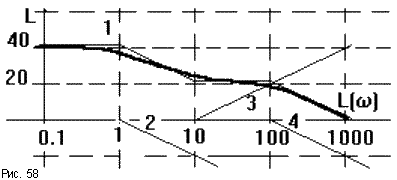 Описанный порядок иллюстрируется на рис.58. Здесь ЛАЧХ может быть представлена суммой ЛАЧХ четырех типовых звеньев: пропорционального W1 = 100, апериодического W2 = 1/(p + 1), форсирующего W3 = 0.1p + 1 и апериодического W4 = 1/(0.01p + 1). Таким образом, передаточная функция разомкнутой САУ имеет вид