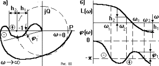 Если АФЧХ разомкнутой САУ имеет сложный вид (рис.80), то ЛФЧХ может несколько раз пересекать линию