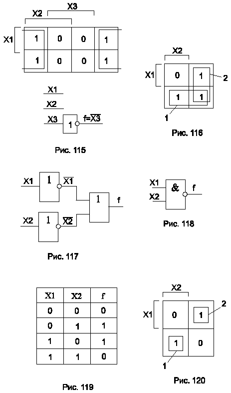 Реализация - рис.117. Реализация после применения закона Моргана - рис.118. Пример 3. Рассмотрим типовую функцию, которая называется “Сумматор по модулю 2” или “Исключающее ИЛИ”. Таблица истинности для неё имеет вид (для двух входов), представленный на рис.119. Обозначе- ние функции “Исключающее ИЛИ”: