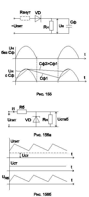 В реальных условиях работы схем выпрямления возможно изменение питающего напряжения и тока нагрузки. Это приводит к изменению среднего значения выходного напряжения схемы выпрямления. Кроме того, напряжение на выходе выпрямителя является пульсирующим. Пульсации напряжения на выходе выпрямителя могут быть уменьшены с помощью фильтра. Схема и диаграммы работы однополупериодного выпрямителя с фильтром на выходе в виде конденсатора Сф представлены на рис.155.