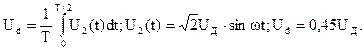Трансформатор Т нужен для того, чтобы на нагрузке Rн иметь заданный уровень выпрямленного напряжения. Графики напряжений и тока в схеме показаны на рис.147. Uд - действующее значение первичного напряжения, U2 -напряжение на вторичной обмотке трансформатора. + ý положительная полуволна; -
