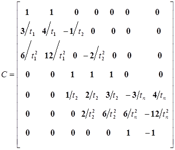 Все неизвестные коэффициенты в полиномах, описывающих изменение присоединенной переменной, могут быть определены путем совместного решения уравнений (15-35), (15-18), (15-20), (15-37), (15-33) и (15-38). Подставляя эту систему уравнений в матричной форме получим: