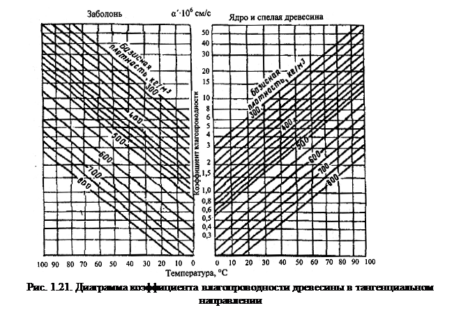 Профессором П.С. Серговским построена диаграмма коэффициента влагопроводности древесины в тангенциальном направлении α 'т (рис. 1.21). В радиальном направлении коэффициент влагопроводности