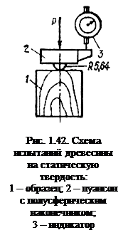 Ударная вязкость древесины характеризует её способность поглощать работу при ударе без разрушения. Её определяют при испытаниях древесины на изгиб с помощью маятникового копра с начальной энергией, пропорциональной высоте его подъёма, и конечной энергией, пропорциональной его взлёту после разрушения им образца (рис. 1.41). По затраченной на излом образца сечением b х h см работе Q = Qнач – Qкон подсчитывают ударную вязкость. Древесина лиственных пород имеет ударную вязкость в 1,5...2,5 раза большую, чем хвойных. Средняя величина ударной вязкости для разных пород составляет 7 ± 4 при влажности 12 % и 6 ± 3 Дж/см2 при 30 % и выше. Резко приложенная изгибающая нагрузка на древесину встречается при ударе судна о причал, при прыжках на лыжах, большой внезапной нагрузке на мост, стул, при падении штанги на помост и т.д. Твёрдость древесины характеризует её способность сопротивляться вдавливанию тела из более твёрдого материала — индентора (пуансона) (рис. 1.42). Все основные отечественные породы по твёрдости торцовой поверхности древесины при нормализованной влажности W = 12 % делят на 3 группы: мягкие (твёрдость до 40 Н/мм2), твёрдые и очень твёрдые (свыше 80 Н/мм2: акация, граб, берёза железная, глоговина, кизил, самшит, железное дерево, тис, хмелеграб, фисташка). Границей деления наших лиственных пород на мягкие и твёрдые является величина твёрдости, равная 50 Н/мм2. Микротвёрдость ранней древесины годичных колец лиственных пород в 1,5...2 раза, а хвойных в 5...6 раз меньше, чем поздней древесины. Твёрдость радиальной и тангенциальной поверхности на 30...40 % ниже торцевой. С твёрдостью древесины связаны её износостойкость на истирание (деревянные настилы, полы, паркет), обработка режущим инструментом, скрепление гвоздями (строительные блоки, тара). С увеличением влажности древесины её твёрдость уменьшается.