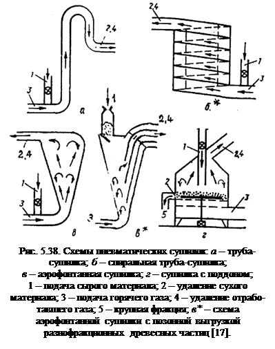 Сушка стружки до влажности 4...6 % (для внутренних слоев 2...4 %) производится в роторных, барабанных, ленточных или пневматических сушилках горячим воздухом либо топочными газами. В роторных сушилках (рис. 5.34) подаваемая через люк 5 стружка в барабане с медленно вращающимся, нагреваемым паром (3 – 4) роторным калорифером в виде пучка гладких паровых труб (с частотой 4...20 об/ ин), прикреплёнными к ним лопатками, перемешивается и постепенно продвигается к выходному отверстию 2 (воздухообмен осуществляется через люки 1 и 6). Они имеют небольшую производительность – до 300 кг сухой стружки/ч. Барабанныесушилки диаметром 1...2м длиной 5...18м медленно вращаются (10...15 об/мин), постоянно поднимая стружку лопатками на внутренней образующей барабана и ссыпая её и сушат стружку во взвешенном состоянии горячими газами (рис. 5.35). Производительность сушилки "Прогресс" длиной Юм с отрицательным углом наклона барабана 2° 1200...4500 кг/час. За границей используют сушилки с В ленточных сушилках (рис. 5.37) стружка 1 сохнет на перемещающихся ленточных сетках 2, перемешиваясь при пересыпании с верхней ленты на нижнюю. Семиэтаж ная сушилка ЦНИИФ-14 имеет производительность 3000 кг стружки/ч.