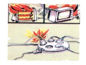 Характерные источники воспламенения при пожарах При эксплуатации приборов периодически проверяйте плотность контактов в местах соединения шнура к клеммам и вилкам. Не оставляйте без присмотра включенные электроприборы. Не включайте несколько мощных токоприемников в одну розетку. При покупке электроприборов и электротехники обязательно ознакомьтесь с мерами безопасности, изложенными в заводских инструкциях и паспортах. Если при включении или выключении бытовой техники в розетку вы Помните, что сложная современная бытовая техника требует заземления. Для этого промышленностью налажен выпуск соответствующих розеток. Телевизор должен быть установлен в проветриваемом месте, вдали от тепловых приборов, иметь калиброванные предохранители и стабилизатор напряжения. Уходя из дома, приучитесь вынимать шнур питания из розетки. Не допускается установка телевизоров в мебельные стенки при отсутствии хорошей вентиляции вокруг телевизора. При первых признаках возникновения аварийного режима (запаха горелой изоляции, дыма) отключите телевизор от сети, выдернув вилку из розетки. Если горение не прекратится, то следует залить очаг загорания водой, накрыть плотным материалом и сообщить о случившемся в пожарную охрану. В случае интенсивного горения телевизора необходимо покинуть помещение во избежание отравления высокотоксичными продуктами горения. Не оставляйте без присмотра электрические приборы, находящиеся под напряжением, тем более на ночь. Электроустановки и электрические сети на дачах, в садовых домиках и подсобных строениях должны отвечать требованиям действующих «Правил технической эксплуатации электроустановок потребителей» и «Правил устройства электроустановок». После закрытия дачи и садовых домиков на длительное время электросеть в них должна быть обесточена на вводе. Если при включении того или иного электроприбора освещение становится чуть темнее, это верный признак того, что электросеть перегружена. Это совсем не обязательно связано со слишком тонкой проводкой. В большинстве случаев проблема кроется в небрежных скрутках электрических проводов или слабо затянутых контактах, а это - предвестник пожара. В данном случае нужно срочно вызывать электрика. Частое перегорание предохранителей может говорить о перегрузках в электрической сети.