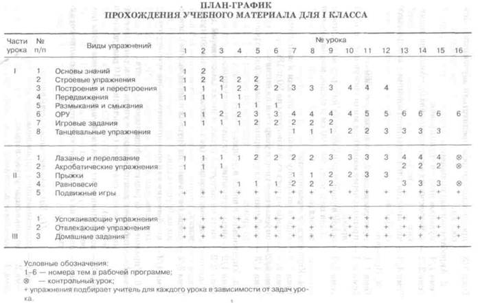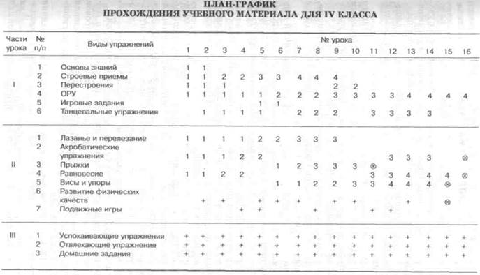 I. Подготовительная часть урока 1. Основы знаний. Тема 1/2 — правила безопасности во время занятий, названия снарядов, используемых на занятиях с учащимися IV класса. 2. Строевые приемы. Тема 1/2 — выполнение команд: «Равняйсь!», «Смирно!» «Вольно!». Тема 2/2 — расчет по порядку. Тема 3/2 — поворот кругом на месте. Тема 4/3 — рапорт учителю. 3. Перестроения. Тема 1/3 — перестроение из одной шеренги в три уступами. Тема 2/3 — перестроение из одной колонны по одному в колонну по три (четыре) поворотом в движении. 4. Общеразвивающие упражнения. Тема 1/5 — комплекс ритмической гимнастики. Тема 2/3 — ОРУ с гимнастическими палками. Тема 3/4 — ОРУ с набивными мячами. Тема 4/4 — ОРУ с использованием гимнастических скамеек. 5. Игровые задания. Тема 1/2 — «Класс — СМИРНО!». 6. Танцевальные упражнения. Тема 1/3 — I и II позиции ног, позиции рук. Тема 2/3 — вальсовый шаг. Тема 3/4 — элементы народных танцев. II. Основная часть урока 1. Лазанье и перелезание. Тема 1/4 — лазанье по канату в три приема. Тема 2/2 — перелезание через бревно высотой 1 м. Тема 3/3 — преодоление полосы препятствий изученными способами. 2. Акробатические упражнения. Тема 1/4 — кувырок назад в группировке. Тема 2/2 — кувырок назад и перекатом назад, стойка на лопатках. Тема 3/3 — комбинация для совершенствования и контрольного урока. 3. Прыжки. Тема 1/1 — прыжки на месте с поворотом на 360°. Тема 2/1 — прыжки через набивные мячи согнув ноги и ноги врозь. Тема 3/3 — вскок в упор стоя на коленях на горку матов, коня, козла на высоту 80-100 см и соскок махом руками вперед. 4. Упражнения в равновесии. Тема 1/2 — ходьба по бревну большими шагами и выпадами. Тема 2/2 — ходьба на носках и повороты на 90 и 180°. Тема 3/2 — опускание в упор и упор стоя на колене. Тема 4/3 — комбинация для совершенствования и контрольного урока. 5. Упражнения в висах и упорах. Тема 1/2 — висы согнувшись, углом, прогнувшись. Тема 2/2 — висы на согнутых руках и ногах (вис завесом двумя); вис на одной (вис завесом); вис на согнутых ногах. Тема 3/2 — упоры (мальчики на брусьях и перекладине), девочки на брусьях р/в. Тема 4/3 — комбинация для совершенствования и контрольного урока. 6. Упражнения на развитие физических качеств. Тема 1 — сгибание и разгибание рук в упоре лежа, руки на гимнастической скамейке (мальчики 8-10 раз, девочки 5-6 раз). Тема 2 — подтягивание из виса (мальчики), из виса лежа (девочки). Тема 3 — из виса на гимнастической стенке поднимание согнутых ног. III. Заключительная часть урока