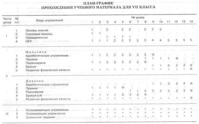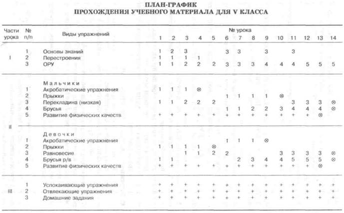 2.5. ДОКУМЕНТЫ ПЛАНИРОВАНИЯ ДЛЯ X-XI КЛАССОВ В старших классах продолжается более углубленное изучение и совершенствование техники гимнастических упражнений: в висах и упорах, опорных прыжках, акробатике, общеразвиваю-щих и строевых упражнениях. Вместе с тем в программный материал включены новые для освоения гимнастические упражнения. На занятиях с юношами используются новые общеразвиваю-щие упражнения силовой направленности: с гантелями, гирями, на гимнастической стенке, скамейке и тренажерах; на занятиях с девушками — более сложные упражнения с предметами: скакалками, обручем, мячом. Большей координационной сложностью отличаются общераз-вивающие упражнения без предметов, проведение их поточным и проходным способами, включение комплексов ритмической гимнастики. Гимнастические упражнения в старших классах направлены прежде всего на развитие силы, силовой и скоростной выносливости различных групп мышц. В этом плане их отличает большая избирательная направленность. Материал программы включает также большой набор упражнений, влияющих на развитие различных координационных способностей и гибкости. Гимнастические упражнения имеют большое прикладное значение: для подготовки юношей к будущей трудовой деятельности и службе в армии, для девушек — для выполнения функции материнства и также для воспитания у них грациозности, красоты движений. Во время уроков учитель должен обращать внимание учащихся на большие возможности гимнастических упражнений не только для развития физических способностей, но и воспитания волевых качеств (особенно в упражнениях на снарядах), формирования красивой осанки, фигуры, походки, поз. В этих целя'х он сообщает необходимые сведения о влиянии гимнастических упражнений и об особенностях методики самостоятельных занятий. Задачи физического воспитания, решаемые в старших классах, возрастные и половые особенности юношей и девушек накладывают свою специфику на организацию и методику учебно-воспитательного процесса. Более отчетливо, чем в среднем школьном возрасте, проявляются различия между юношами и девушками, что требует дифференцированного подхода к выбору средств, методов и организации занятий. Большое внимание следует уделять оздоровительным и воспитательным задачам, которые решаются на каждом уроке в тесной взаимосвязи с образовательными задачами и развитием двигательных способностей. Важным условием успешной работы учителя является грамотное планирование программного материала. Основой для планирования учебных занятий является материал по овладению двигательными умениями и навыками и развитию соответствующих кондиционных и координационных способностей. Для контроля за ходом учебно-воспитательного процесса нужно планировать контрольные упражнения. Они выполняются по ходу овладения навыками для корректировки обучения, в конце периода изучения какого-то раздела для оценки эффективности овладения навыками. Тематизированная рабочая программа для X класса Юноши I. Подготовительная часть урока 1. Основы знаний. Тема 1/1 — обеспечение техники безопасности. Тема 2/2 — основы биомеханики гимнастических упражнений. Тема 3/3 — влияние упражнений на телосложение и функции организма. 2. Передвижения. Тема 1/3 — поворот кругом в движении. 3. Общеразвивающие упражнения. Тема 2/4 — ОР