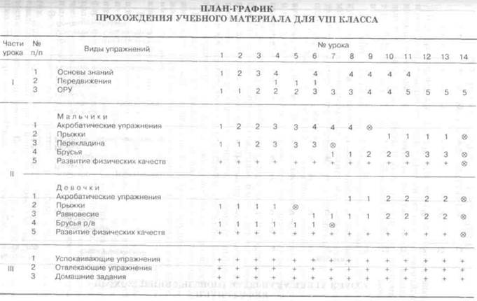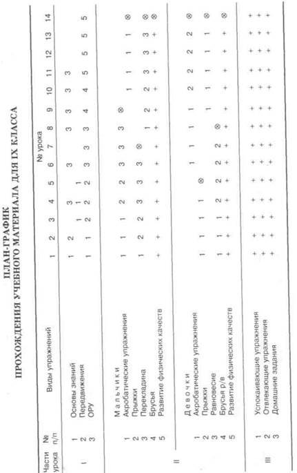 Тема 1/6 — комбинация для совершенствования навыков и контрольного урока. 7. Упражнения на развитие физических качеств. Тема 2 — упражнения на развитие силы отдельных групп мышц. Тема 3 — комплексное развитие физических качеств посредством круговой тренировки. III. Заключительная часть урока Тема 1 — успокаивающие упражнения. Тема 2 — отвлекающие упражнения. Тема 3 — домашние задания. Тематизированная рабочая программа для IX класса /. Подготовительная часть урока 1. Основы знаний. Тема 1/1 — обеспечение техники безопасности. Тема 2/1 — упражнения для самостоятельной тренировки. Тема 3/6 — страховка и помощь во время занятий (дается непосредственно во время обучения упражнениям). 2. Передвижения. Тема 1/3 — передвижение вперед (назад, в сторону) на определенное количество шагов по команде: «Два (три, четыре и т. д.) шага вперед (назад, в сторону) шагом—МАРШ!». 3. Общеразвивающие упражнения. Тема 1/2 — ОРУ без предметов (поточным способом). Тема 2/3 — ОРУ со скакалками. Тема 3/3 — ОРУ с гантелями. Тема 4/2 — ОРУ со скамейками. Тема 5/4 — ритмическая гимнастика. II. Основная часть урока 1. Акробатические упражнения. Мальчики Тема 1/3 — из упора присев силой стойка на голове. Тема 2/2 — с трех шагов разбега кувырок вперед прыжком. Тема 3/3 — комбинация для совершенствования навыков и контрольного урока. Девочки Тема 1/4 — равновесие на одной, выпад вперед и кувырок вперед. Тема 2/4 — комбинация для совершенствования и контрольного урока. 2. Прыжки. Тема 1/4 — прыжок согнув ноги через козла в длину (высота 115 см). Девочки Тема 1/4 — прыжок боком через коня в ширину (высота 110 см). 3. Упражнения в равновесии (девочки). Тема 1/5 — комбинация для совершенствования навыков и контрольного урока. 4. Упражнения на высокой перекладине (мальчики). Тема 1/1 — из виса подъем переворотом в упор силой и медленное опускание в вис. Тема 2/2 — из виса на одной (виса завесом) подъем в упор ноги врозь (упор верхом). Тема 3/3 — комбинация для совершенствования навыков и контрольного урока. 5. Упражнения на брусьях (мальчики). Тема 1/1 — из размахивания в упоре сгибание и разгибание рук на махе вперед. Тема 2/2 — из размахивания в упоре на предплечьях подъем махом вперед в сед ноги врозь. Тема 3/3 — комбинация для совершенствования навыков и контрольного урока. 6. Упражнения на брусьях р/в (девочки). Тема 1/3 — вис прогнувшись на н/ж с опорой ступнями о в/ж и переворот в упор на н/ж. Тема 2/4 — комбинация для совершенствования навыков и контрольного урока. 7. Упражнения на развитие физических качеств. Тема 2 — упражнения на развитие силы отдельных мышечных групп. Тема 3 — комплексное развитие физических качеств посредством круговой тренировки. ///. Заключительная часть урока Тема 1 — успокаивающие упражнения. Тема 2 — отвлекающие упражнения. Тема 3 — домашние задания.