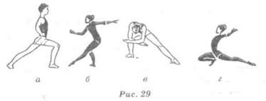 Выпады Выпад выполняется выставлением ноги в любом направлении с одновременным сгибанием ее. Выпад правой (левой) — выставление ноги вперед с одновременным сгибанием ее так, чтобы колено находилось на уровне носка, а ступня другой ноги несколько поворачивалась носком наружу (рис. 29, а). Выпад назад — выставление ноги назад (рис. 29, б). Выпад с наклоном — соединение выпада с одновременным наклоном туловища вперед, руки свободно скрещиваются перед коленом выставленной ноги. Например, выпад вправо с наклоном (рис. 29, в). Глубокий выпад — выпад с максимальным разведением ног. Положение рук и туловища указываются дополнительно. Например, глубокий выпад правой, руки в стороны-назад (рис. 29, г).
