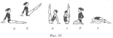 Сед — положение занимающегося сидя на полу или на снаряде с прямыми ногами, руки касаются опоры или находятся в каком-либо положении (рис. 31, а). Сед углом — положение сидя с поднятыми вперед ногами, образующими с туловищем прямой угол (примерно), голова прямо (рис. 31, б). Сед согнувшись — сед, при котором ноги подняты до вертикального положения (рис. 31, в). Сед с захватом — то же, но туловище и голова наклонены к ногам, а ноги захватом за голеностопные суставы подтягиваются к туловищу, голова опущена (рис. 31, г). Сед на пятках — сед на обеих пятках, туловище вертикально, руки обычно на поясе (рис. 31, д). Сед на пятках с наклоном — аналогичный сед, но туловище наклонено вперед до касания поднятыми вверх руками пола (рис. 31, е). Разновидности положения лежа: на спине — ноги сомкнуты, прямые, руки вдоль тела. Иное положение рук указывается дополнительно; на животе — согнутые руки касаются пола, сомкнутые прямые ноги лежат свободно;