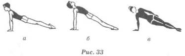 Упор лежа — занимающийся обращен передней стороной тела к опоре. Термин «спереди» принято опускать (рис. 33, а). Упор лежа сзади — учащийся обращен к опоре спиной (рис. 33, б). Упор лежа боком — тело обращено боком при опоре на одну руку, другая рука обычно у тела (рис. 33, в). Упор лежа на бедрах — упор, при котором тело максимально прогнуто, бедра касаются опоры или лежат на ней (рис. 34, а).