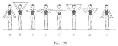 Несимметричные положения с палкой Палку к плечу — палка удерживается у плеча большим и указательным пальцами, остальные поддерживают ее снизу (рис. 39, а). Это основное положение с гимнастической палкой во время передвижения. С палкой «вольно» — положение занимающегося соответствует стойке «вольно» в разомкнутом строю без предмета. Левый конец палки при этом касается пола около левого носка, левую руку на пояс (рис. 39, б). Палку вправо (влево) — палка удерживается правой (левой) рукой за один конец, составляя с нею прямую линию (рис. 39, в).в Палку вправо (влево)-книзу (кверху) — палка поднята или опущена на 45° от положения «палку вправо (влево)». Палку к плечу вперед (вправо, кверху, вправо-кверху и др.) — левая рука удерживает палку у правого плеча, а правая в указанном направлении (рис. 39, г, д). Палку к бедру кверху (вправо, вперед) — палка удерживается у правого (левого) бедра разноименной рукой, а одноименной рукой в указанном направлении (рис. 39, е). Палку на голову вправо (за голову, на грудь, и т. п.) — палка удерживается левой рукой за конец и касается головы, а правой — в указанном направлении (рис. 39, ж).