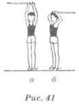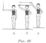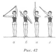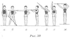 Палка мо,: от удерживаться обеими руками за один конец, например: руки вверх, палку вправо (рис. 41, а) или руки вверх, палку назад (рис. 41, б). Могут быть и иные положения палки: