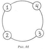 Примерная схема организации круговой тренировки на уроках гимнастики следующая. На первом уроке учащиеся знакомятся с расположением станций и организацией занятий на них, последовательностью выполнения и т. п. На втором уроке определяют МТ (максимальный тест, т. е. максимальное количество повторений) выполнения упражнений на каждой станции, нагрузки по схеме МТ: 2 или МТ: 4 в зависимости от физической подготовленности учащихся, на 3-6-м уроке по схеме (МТ: 4) + 1 или (МТ: 2) + 1 с последующим увеличением на каждом занятии на одно или несколько повторений. На 7-м уроке определяется новый МТ. В комплексы круговой тренировки на уроках гимнастики подбираются упражнения, преимущественно направленные на развитие мышц плечевого пояса, рук, живота и спины, увеличение подвижности суставов, укрепление всей мускулатуры, а также тренировку вестибулярного аппарата. Для примера приведем несколько вариантов круговой тренировки для основной части урока гимнастики. Наиболее распространенными здесь являются упражнения для развития силы. Как уже отмечалось выше, для этой цели более эффективен комбинированный метод, используемый по принципу круговой тренировки. При этом возможны два варианта*. "Приводятся из кн.: Система подготовки юных гимнастов: Метод, пособие / Сост. A.M. Шлемин, П.К. Петров. — М.: ГЦОЛИФК, 1977. Первый вариант Упражнения проводятся по кругу для развития силы мышц разных частей тела с использованием одновременно всех четырех методов развития силы (рис. 44).