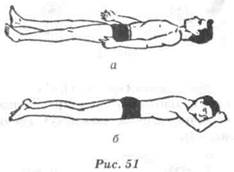 Первая группа Основные позы для полного отдыха. 1. Поза идеального отдыха (шавасана). Эта поза очень важна для отдыха и расслабления, так как выполнение любой сложной асаны без последующего расслабления малоэффективно. Между асанами ее следует выполнять в течение 15-20 и до 60 с. В конце занятия время нахождения в этой позе может достигать нескольких минут. Выполняется шавасана лежа на спине. Руки вдоль туловища, ладони вверх или вниз, пальцы слегка согнуты. Голова отклонена вправо или влево. Глаза закрыты (рис. 51, а). Нужно постараться полностью расслабиться. Мысленно проследить постепенное расслабление ног, начиная с пальцев, стоп, голеней и заканчивая бедрами. Почувствовав в ногах тяжесть и легкое тепло, перейти к расслаблению рук, начиная с пальцев, кистей, предплечий и заканчивая плечами. Когда руки станут полностью расслабленными, тяжелыми и вы почувствуете, как по рукам струится легкое тепло, можно переходить к расслаблению мышц живота, контролируя расслабление всех мышц живота, свободное ровное дыхание и спокойное, ритмичное сердцебиение. 2. Поза крокодила (макрасана). После выполнения поз, таких как дханурасана и бхуджангасана, для того чтобы сразу расслабиться не переворачиваясь на спину, и принимают макрасану. Выполняя макрасану, надо лечь на живот, ноги слегка развести, носки оттянуть. Руки, согнутые в локтях, можно положить под голову, а можно расположить за головой. Голову либо повернуть в сторону, либо лбом коснуться пола (рис. 51, б).