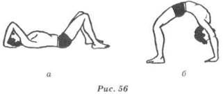 Находиться в позе следует от 15 с до 2 мин, а затем выполнить ее в другую сторону. Такое спиралевидное положение позвоночника обеспечивает самое быстрое его расслабление. Поэтому асана излечивает боли в спине, исправляет дефекты позвоночника. Активизируется работа всех органов пищеварения, а также селезенки, мочевого пузыря, половых желез. 7. Половинная поза круга, мостик (ардха чакрасана). Асана может выполняться из двух исходных положений: лежа и стоя. Наиболее простой вариант из положения лежа на спине. Согнуть ноги в коленях и поставить ступни параллельно на ширине плеч как можно ближе к тазу. Руки согнуть и поставить ладонями на пол, на уровне ушей, пальцы должны быть направлены к плечам (рис. 56, а). После этого, разгибая руки и ноги, поднять тело вверх. Хорошо прогнуться, голову наклонить назад (рис. 56, б). Удерживать «мост» приблизительно 1 мин, сохраняя напряженными мышцы спины и концентрируя внимание на позвоночнике. Дыхание спокойное, равномерное. Эта асана очень эффективна при дефектах осанки: исправляет сутулость и боковые искривления, повышает гибкость позвоночника. Сти- 24Ц Третья группа Упражнения группы предназначаются для улучшения функции органов брюшной полости и симпатического ствола вегетативной нервной системы, а также укрепления мышц туловища. 1. Поза кобры (бхуджангасана). Лечь лицом вниз, ладони на полу около плеч. Полный вдох и, медленно поднимая голову, отклонить ее назад подальше. Следом же, напрягая мышцы спины, поднимать плечи и туловище (лишь в конце помогая руками), но так, чтобы пупок оставался на полу (рис. 57, а). Внимание сосредоточивать сначала на области щитовидной железы, а затем, по мере выгибания, — на позвоночнике, сверху вниз. Лишнее напряжение тела снять. Через 5-10 с опустить голову вперед, расслабив мышцы шеи, и сразу же медленно начинать поворачивать голову направо так, чтобы можно было увидеть пятку левой ноги. Плечи при этом остаются неподвижными (рис. 57, б).