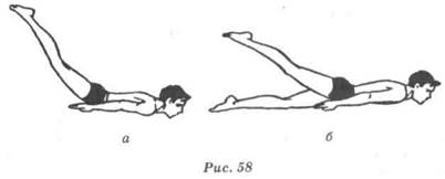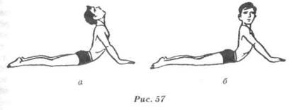 2. Кузнечик (салабхасана). Лечь лицом вниз, лбом и носом касаясь пола. Руки вдоль туловища ладонями вниз. Сделав небольшой вдох, поднять как можно выше обе ноги, опираясь на руки, грудь и плечи (рис. 58, а). Выдержать позу 15-20 с и вернуться в и. п., расслабиться. Вначале можно начинать с позы половинного кузнечика (ардха салабхасана), т. е. поднимать только одну ногу (рис. 58, б).