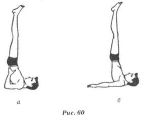 Для полного выхода в эту позу необходимо вначале выполнить саламба сарвангасану, затем опустить руки на пол. Внимание сосредоточивать попеременно в области таза, на позвоночнике и солнечном сплетении. Сарвангасана нормализует и стимулирует функции практически всех систем организма, заряжает энергией щитовидную и половые железы, укрепляет органы дыхания, излечивает заболевания легких, а также улучшает работу сердечно-сосудистой и пищеварительной систем. Нормализует кровяное давление. 2. Плуг (халасана). Это — одна из популярнейших поз хатха-йоги. Существует два варианта ее выполнения. Вначале разберем наиболее простой способ. И. п. — лежа на спине, ноги вместе, руки вдоль туловища, ладонями книзу, голова прямо. Выполняя вдох, очень медленно поднимать прямые ноги до тех пор, пока пальцы ног не коснутся пола за головой (рис. 61, а). Во время удержания колени должны быть прямые, дыхание ритмичное, свободное. Мысленным взором медленно пройтись от шейных позвонков до нижних и обратно. Сосредоточиваться и на солнечном сплетении. Начинать удерживать положение следует не более, чем с 10-15 с. Освоив первый способ халасаны, можно приступить к более сложному варианту. Разница между двумя способами лишь в положении рук (рис. 61, б).
