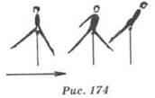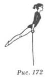 Комбинация для контрольного урока 1. На концах жердей прыжком упор и перед рук поворот кругом — 2,0 балла. 2. Упор согнув ноги и сед ноги врозь — 2,0 балла. 3. Опускание в упор лежа ноги врозь на предплечьях — 2,0 балла. 4. Перемах внутрь и мах назад — 2,0 балла. 5. Мах вперед и соскок махом назад внутрь брусьев — 2,0 балла. Брусья р/в Девочки VI класса продолжают совершенствовать выполнение смешанных висов, перемахов, осваивают размахивание изгибами в висе на в/ж, упор на н/ж. Из виса стоя прыжком упор на н/ж Техника выполнения. В целом техника выполнения упора на брусьях р/в аналогична упорам на коне, бревне, освоенных учащимися еще во II классе. Однако выполнение упора на н/ж брусьев р/в отличается условиями опоры (рис. 172). Тело гимнастки выпрямлено и уравновешено относительно опоры, положение в плечах — высокое, активное. Выполняется из виса стоя прыжком лицом внутрь или наружу брусьев. Последовательность обучения. 1. Прыжком в упор на коне, козле. 2. Прыжком в упор на бревне. 3. Прыжком в упор на н/ж брусьев р/в. Из виса на в/ж размахивание изгибами Техника выполнения. В висе на в/ж приподнять прямые ноги вперед и, не задерживая их в конечном положении, легким броском отвести назад, подавая плечи вперед. Проделать это несколько раз подряд, постепенно увеличивая амплитуду движений (рис. 173). Последовательность обучения. 1. Из виса на в/ж прогнуться и вернуться в и. п.