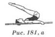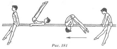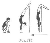 Техника выполнения. Из виса стоя толчком двумя принять вис согнувшись сзади и вис на согнутых ногах и руках (вис за-весом двумя). Отпуская руки, медленно разогнуться в тазобедренных суставах и выполнить вис на согнутых ногах, руки вверх (в стороны). Опираясь ладонями на мат под перекладиной, стойка на руках и упор присев (рис. 180).