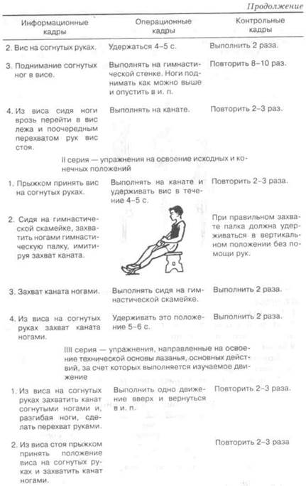 Лазанье по канату в висе на согнутых руках с захватом каната ногами Техника выполнения. В висе на согнутых руках (см. рис. кадр 1) согнуть ноги вперед и захватить канат ногами скрестно так, чтобы наружная сторона стопы одной ноги и внутренняя сторона голени другой (правой или левой) плотно прижимались к канату (кадр 2). Разгибая ноги, подтянуться еще выше и, сохраняя захват каната ногами, поочередно перехватиться руками выше так, чтобы остаться в висе на согнутых руках (кадр 3). Далее действия повторяются. При опускании вниз все действия чередуются в обратном порядке.