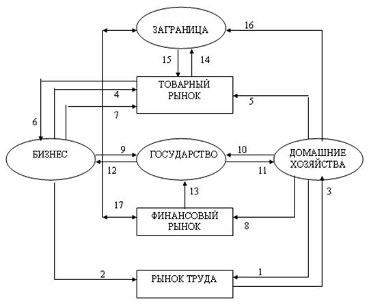 Модель открытой экономики с включением сектора заграницы в рыночное функционирование можно представить в виде схемы, изображенной на рис. 1.3.