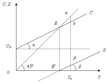 Рис. 3.4. Построение функций потребления и сбережений Построение линии потребления С: Линия С начинается не с 0, а от С0. Отрезок ОС0 характеризует автономное потребление. Наклон линии С определяется предельной склонностью к потреблению Cy. Cy = tgα – тангенс угла наклона линии потребления (предполагаем, что Су = const). Построение линии сбережений S: Линия S строится путем вычитания значений С из соответствующих значений вспомогательной линии (биссектрисы). Вспомогательная линия выходит из начала координат под углом в 450. На биссектрисе в каждой ее точке значение дохода (Y) равно сумме потребления (С) и сбережения (S). Чтобы построить линию S, необходимо найти две точки, при условии, что функция S линейна. Линия сбережений может быть построена двумя способами. Первый способ изображен на рис. 3.4. Первая точка (Е /) находится путем проекции точки Е на ось абсцисс, т.к. в точке Е: Y = C, S = 0. Для поиска другой точки следует взять любое произвольное значение Y, которое позволяет домашним хозяйствам не только потреблять, но и сберегать (например, Ya). Отрезок аb показывает превышение Y над C, т.е. величину S. Точка F находится путем откладывания отрезка аb на вертикальной линии, берущей начало из Y (FYa = ab). Линия, проходящая через точки Е / и F, - это линия S. Тангенс угла β равен Sy. Второй способ изображен на рис. 3.5.