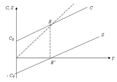 Рис. 3.5. Второй способ построения функции сбережений Согласно второму способу первая точка Е образуется в результате пересечения функции потребления С с биссектрисой. Далее эта точка проецируется на ось абсцисс – точка Е’. Вторая точка получается следующим образом. При нулевом доходе Y потребление равно автономному С0, т.е., чтобы потреблять в данном случае нужно “проедать” сбережения. Следовательно вторая точка функции сбережений откладывается на оси ординат на расстоянии равному С0 и имеет отрицательное значение. Отметим, что функцию С будет описывать кривая выпуклой формы, а функцию сбережения S – кривая вогнутой формы, если обе функции нелинейны. Доля потребления и сбережения в доходе определяется субъективно на основе привычек, традиций и психологической склонности домашних хозяйств к сбережению. Date: 2015-08-15; view: 578; Нарушение авторских прав |