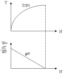 где WD – номинальная заработная плата (ставка з/п спроса на труд), N – уровень занятости, Y = f(N) – производственная функция,
