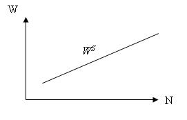 В свою очередь функция спроса на труд будет зависеть от уровня цен и рост производительности труда. Ее график изображен на рис. 5.1 (б). При этом факторами рыночного спроса на рабочую силу и, следовательно, на ресурсы труда являются: · · уровень цен на ресурсы труда, т. е. уровень заработной платы; · степень заменяемости капитала трудом в процессе производства; · фаза экономического цикла: в фазе подъема спрос на трудовые услуги растет, в фазе спада – сокращается; · сложившаяся экономическая конъюнктура увеличивает или сокращает спрос на трудовые услуги; · научно-технический прогресс, с одной стороны задает предпосылки для высвобождения части работников или предъявляет к ним новые требования к их структуре и качеству, что сопровождается сокращением занятости, а с другой – вызывает спрос работников новых профессий и специальностей. Предложение труда (WS) представляет собой сумму объемов предложения ресурсов труда всей численности работников в стране при каждой возможной цене на них. Другими словами, предложение труда формирует рабочая сила. Понятиерабочей силыможно охарактеризовать разными способами. Она представляет собой: а) способность человека к труду; б) совокупность физических и умственных способностей человека, которые используются им в процессе производства жизненных благ; в) общее количество работников в стране; г) часть населения, включающая занятых, самозанятых и ищущих работу (безработные). Функция предложения зависит от номинальной ставки заработной платы (W) и уровня цен в стране (Р). Зависимость функции предложения от уровня цен будет показана в модели взаимодействия спроса и предложения в теме 5.3. Так как основным фактором, влияющим на величину работающего населения, является уровень заработной платы, то функция предложения будут строиться на следующих осях: W и N. График функции предложения имеет положительный наклон (рис. 5.2).