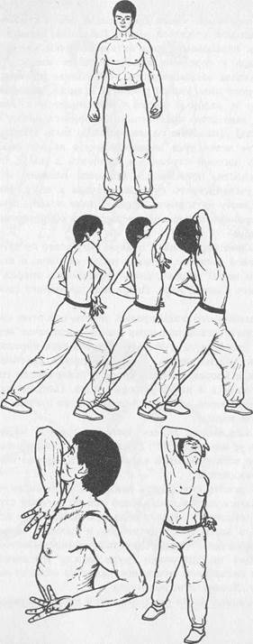 КОМПЛЕКС ФОРМАЛЬНЫХ УПРАЖНЕНИЙ У—ШУ «САНЬ ХУАН ФА» В «арсенале» различных школ у—шу, как и во других видах единоборств Востока, имеются комплексные упражнения, в которых закрепляется базовая техника, так называемые упражнения «формального» типа (ката — в карате, тао — в у—шу). Эти упражнения соответствуют достаточно высокому уровню подготовки, т.к. сочетают в себе технику перемещений с блоками и ударами, координацию движений и пластику, ритмику дыхания с концентрацией и релаксацией. Поэтому исполнение «формальной техники» является непременным условием квалифицированных выступлений, в которых спортсмены демонстрируют свое мастерство. В предлагаемом тао «Сань Хуан Фа» («Три владыки») по школе Цай сохраняются древние традиции этой внутренней школы: неразрывное сочетание элементов разминочной гимнастики и пластики, зашифрованных боевых движений с дыхательными упражнениями и элементами китайской акупрессуры. Движения в этом комплексе чередуются в непрерывной плавной последовательности, но с определенной ритмикой: на вдохе медленно, на выдохе ускоренно. Руки скользят по телу, вписываясь в его рельеф, или перемещаются максимально близко от него. Особое внимание обращается на синхроннось перемещений с дыханием и движением рук. Для обеспечения разучивания и отработки синхронности весь комплекс условно разбит на 21 позицию, начало и окончание которых можно проконтролировать с помощью поясняющих рисунков и схем перемещения ног. Исходное положение, стоим прямо, ноги слегка расставлены, руки свободно опущены вдоль бедер, ладони повернуты к телу. 1. На вдохе отставляем назад правую ногу и поворачиваемся влево на 90°, при этом сгибая в колене левую ногу. Одновременно правая рука, разворачиваясь против часовой