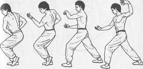 3. «Змея обвивает камень» (рис 48). Это движение соединяет ИП — как в предыдущем упражнении. На вдохе делаем шаг правой ногой вперед, колено слегка согнуто. Руки, сгибая в локтях, поднимаем перед собой до уровня головы, ладони повернуты вперед. Левая рука касается запястья правой, правый локоть держим несколько выше левого. Корпус слегка прогибается вперед, плечи на месте. На выдохе поворачиваемся влево на 180°, подавая таз вперед, а верхнюю часть туловища назад (относительно исходной позиции). Одновременно руки (правая снизу, левая сверху), совершая круговое движение, опускаются вниз и поднимаются вверх в вертикальной плоскости, останавливаясь на уровне головы. Колено правой ноги согнуто, вес тела в основном на этой ноге. Левая нога слегка согнута, стопа всей поверхностью касается пола, носок направлен вперед. Поворачиваясь на носках вправо, возвращаемся в исходное положение. Повторяем упражнение попеременно с правой и левой ноги по 4 раза. Это упражнение является хорошим разминочным средством для суставов позвоночника и верхнего плечевого пояса. Согласно восточной традиции, гибкий позвоночник является необходимым условием сохранения здоровья и эффективной профилактики болезней. При выполнении упражнений 2 и 3 важно обратить внимание на формирование «замков». Для этого таз максимально закручиваем в направлении поворота, колено опорной ноги смотрит в сторону. Такое положение обеспечивает устойчивость тела в конечной фазе движения. 4. «Дракон разгоняется» (рис 49). Это движение объединяет ИП — ноги занимают положение аналогичное упр.1, левая рука вытянута вперед, слегка согнуты в локте, плечо и раскрытая ладонь параллельны полу, кисть сформирована «стоящую ладонь». Правая рука находится у бедра, раскрытая ладонь параллельна полу, кисть сформирована в «скрученную ладонь». На вдохе делаем шаг правой ногой вперед и одновременно перемещаем правую руку вперед-вверх, кисть сформирована в «стоящую ладонь». На выдохе сгибаем правую ногу в колене, а согнутую в колене левую ногу переносим вперед (сзади правой ноги), носок касается пола, пятка направлена вверх, левое колено прижато к правой икре. При этом корпус поворачивается на 90° влево, правый бок
