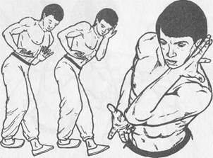 Руки при этом совершают третье базовое движение (правая вверху, левая — у левого бедра). Смотрим прямо перед собой. 7. Делаем вдох и, перенося вес тела на правую ногу, под Одновременно руки совершают четвертое базовое движение (правая кисть вверху, левая — у правого локтя). Смотрим прямо. 8. Делаем вдох и, перенося вес тела на левую ногу, подтягиваем Руки при этом движутся вперед, совершая пятое базовое движение. Смотрим прямо. 9. Делаем вдох, одновременно складываем руки в «голову уда На выдохе, опуская «голову удава» вниз, приставляем левую ногу к правой, распрямляем ноги и, опуская руки, разводим их в стороны к бедрам. Смотрим прямо. При этом возвращаемся в исходную стойку, повернутую на 180° относительно исходного направления. Затем повторяем все упражнения в обратном направлении и возвращаемся в исходное положение. Перемещение по кругу мы здесь не приводим, так как оно соответствует более высокому уровну подготовки занимающихся.