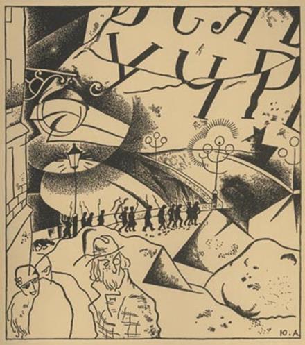 Шрифт неудобочитаем и непропорционален, но все же связан с изображением подобно тому, как он связан в работах Морриса. Чувствуется, что художник думает о композиции в целом, принимает во внимание соотношение белого и черного на листе. Уже к 1913-ому году стало очевидно, что впереди - совсем не такое розовое будущее, каким оно казалось на рубеже веков. Впереди лежал век небывалых катастроф, революций и войн.