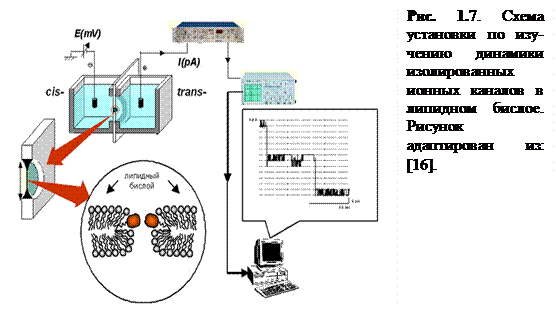 Изучая динамические особенности изолированных RyR-каналов независимо друг от друга несколько авторов исследовало поведение RyR-каналов в лабораторных условиях в липидных бислоях при постоянных концентрациях ионов Са2+ в растворе в условиях отсутствия кальциевой стимуляции [17-19]. Схема типичной установки представлена на рис. 1.7. В экспериментах раствор разделяется на две части липидным бислоем, имитирующим клеточную мембрану, в котором закрепляется RyR-канал. Та часть, которая соответствует люменальной стороне канала называется trans, цитозольной стороне – cis. В работах [17-19] помощью подобных установок была проведена серия экспериментов по регистрации ионных токов, проходящих через одиночный канал при различных концентрациях Са2+ в растворе. Отсутствие тока указывало на нахождении канала в закрытом состоянии, а их присутствие – на его открытие. Первым важнейшей особенностью RyR-канала как нанообъекта является стохастический характер процессов открытия/закрытия при постоянных значениях концентраций
