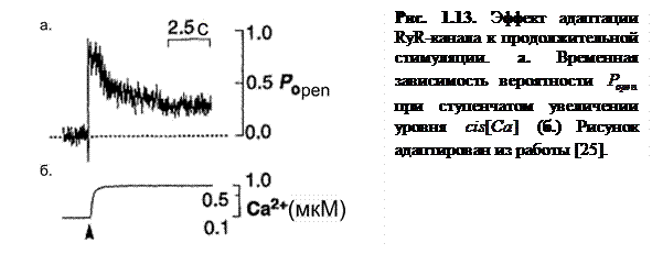 Сложная регуляция RyR-канала кальцием впервые была обнаружена в работе [29] при проведении экспериментов в плоском липидном бислое. Показано, что резкое увеличение cis[Ca] (~ 1 мс) сначала быстро активирует одиночный RyR-канал до высокого уровня вероятности