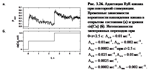 При последующих резких повышениях уровня cis[Ca] в экспериментальных работах также наблюдался эффект адаптации (рис.3.25б). Серия численных экспериментов, проведенных в данной работе на основе ЭК-теории показала, что данная модель позволяет воспроизвести вышеописанные экспериментальные данные (рис. 3.26).