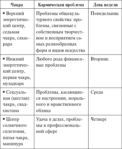 Чакры и дни недели Чакр, как вы уже знаете, в общей сложности семь – ровно столько, сколько дней в неделе. Каждой чакре соответствует свой день недели. В таблице обозначены эти соответствия и отмечены проекции каждой из семи чакр на конкретные группы личных проблем, характерных для многих моих пациенток.