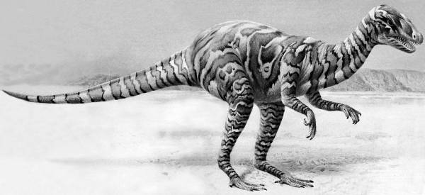 Рис. 3. Ставрикозавр (Staurikosaurus pricei, «ящер созвездия Южного Креста») из семейства ставрикозаврид подотряда теропод (звероногов) отряда заурисхий (ящеротазовых динозавров) был ловким двуногим хищником и охотился в среднем триасе, не подозревая, что в конце этого периода его отсталые родичи прозауроподы встанут на четвереньки и дадут начало крупнейшим наземным животным планеты, зауроподам. [37, с. 30–31]