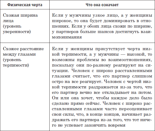 Выстраивая взаимоотношения, мы ищем в другом человеке черты, схожие с нашими собственными. Это вовсе не означает, что так мы избавляем себя от всевозможных проблем и трений в будущем, однако близкие черты увеличивают совместимость. У всех нас есть сильные и слабые стороны, но именно то, как мы над ними работаем, в конечном счете и определяет наш характер. Многие пары, с которыми я работала, говорили о том, что, если бы они сразу обратились к специалисту по физиогномике, то сумели бы миновать множество неприятных ситуаций в браке. Пары, у которых есть проблемы, не раз признавались, что информация, полученная во время консультаций, полностью перевернула их взаимоотношения. Знание черт характера своих партнеров помогло им лучше понять друг друга. Их отношения были для них достаточно важны, чтобы посвятить время узнаванию и изучению друг друга. Одна женщина сказала, что ее муж, по характеру совсем не подарок, теперь изменился, и жить с ним стало гораздо комфортнее – больше никаких нервов или непонимания. Впервые за многие годы он нашел время, чтобы провести его со своей семьей.