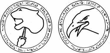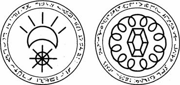 В Г Рис. 9 (А-Г). Медальоны с символами, которые носят члены Совета Символы даны у уменьшенном виде. Размеры и цвет медальонов могутбыть разными, но они почти всегда имеют круглую форму и висят у Старейших на шее всех медальонов по краю имеется ободок, на котором выгравирована надпись которую душа обычно не может разобрать.