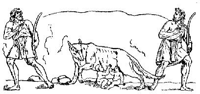 Но Амулий хотел царствовать один и вытеснил Нумитора. Для большей своей безопасности он убил сына Нумитора, а дочь его сделал весталкой — жрицей богини домашнего очага Весты. Весталки должны были оставаться девственницами. Но дочь Нумитора Рея Сильвия нарушила принятый на себя обет и родила от бога Марса двух детей. Жестокосердный дядя тотчас после их рождения велел положить мальчиков в корыто и бросить их в Тибр. Мать подверглась заключению. Но корыто зацепилось за смоковницу, и, когда поднявшаяся вода Тибра снова вошла в свои берега, дети остались на твердой земле и были вскормлены волчицей. Вскоре их нашел царский пастух Фаустул и отнес своей жене Лауренции, которая только что родила мертвого сына. Фаустул воспитал найденных детей, назвал их Ромулом и Ремом и сделал из них пастухов. Оба мальчика с ранних лет выказали физические и умственные способности. Они пасли царские стада и охотились в горах, на которых впоследствии был построен Рим. Жили они в хижинах, выстроенных ими самими из дерева и тростника. Одна из этих хижин как святыня сохранялась и поддерживалась еще во времена историка Дионисия (около 30 года до Р. X.). Когда Ромул и Рем достигли восемнадцатилетнего возраста, одно случайное происшествие совершенно изменило их общественное положение. Однажды они поссорились из‑за выгонной земли с пастухами Нумитора, который жил в Альба‑Лонге, несмотря на свое смещение. Ромул и Рем поколотили своих противников, и те решили отомстить им. Во время одного праздника они подкараулили братьев, схватили Рема и привели его к царю. Амулий отослал Рема к Нумитору, чтобы тот наказал его по своему усмотрению. По решительным манерам и смелому обращению Нумитор понял, что этот пастух высокого происхождения. Сходство лица навело его на верный след, и он догадался, что Рем его внук.